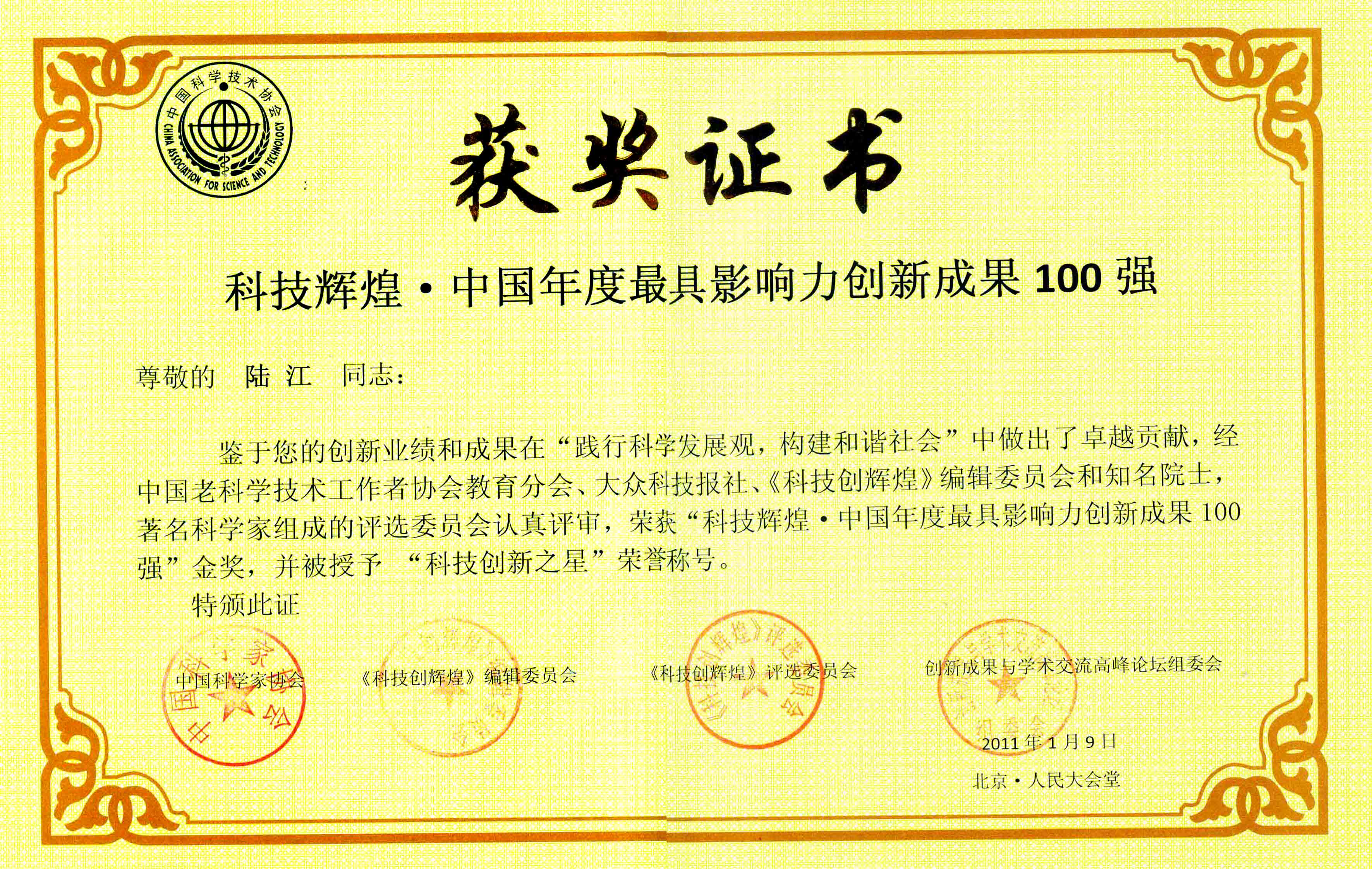陸江的論文獲一等獎榮譽證書-- 陸江論文獲創新論文獎牌